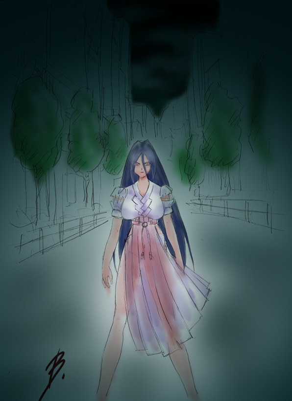 少女とも、大人の女性とも区別しづらい微妙な外見の人物の手には、長細く布で包まれた何かがしっかりと握られていた。何故か白の着物に緋袴という、いわゆる巫女さんの服装を着ているのだが、それが異常さを醸し出すとともに、彼女には似合っていた。着こなしている……と言えなくも無い。