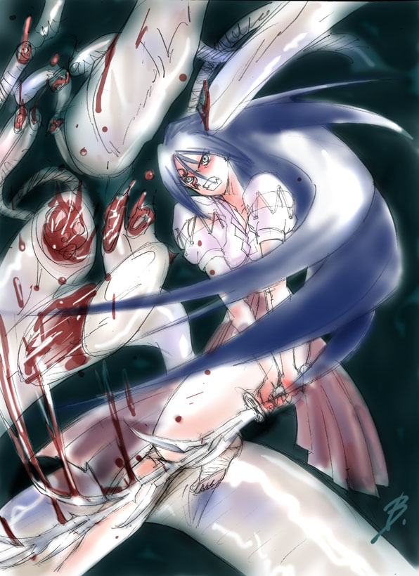 ふくらはぎに、太股に、表面を脈動させた触手が這い回る……しかもそれは彼女の忌み嫌う邪のものである。巴の絶望といえばすさまじいものだろう。ついに両足をさかのぼっていた二本の触手は、それぞれ膣の入り口と菊座にたどり着いた。全力で抵抗していた巴の力も一層激しさを増す。